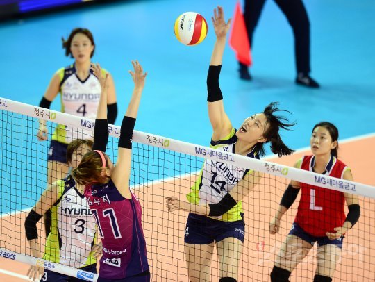 26일 청주실내체육관에서 ‘2016 청주-KOVO컵 프로배구대회’ 흥국생명과 현대건설 경기가 열렸다. 현대건설 양효진이 흥국생명의 블로킹 사이로 스파이크 공격을 하고 있다.