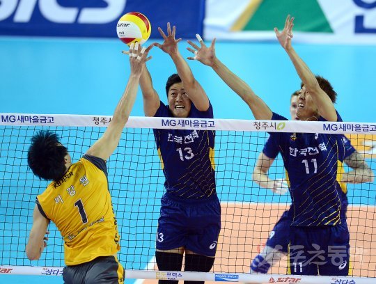 26일 청주실내체육관에서 ‘2016 청주-KOVO컵 프로배구대회’ 남자부 KB손해보험과 한국전력 경기가 열렸다. 한국전력 정주형과 윤봉우가 KB손해보험 이강원의 공격을 블로킹 하고 있다.