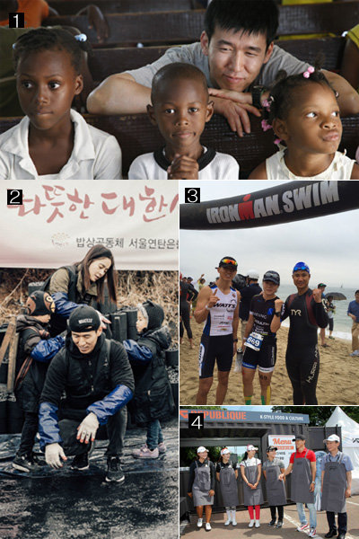 힙합그룹 지누션의 션은 배려를 몸소 실천하고 있다. 그는 “배려를 함으로써 상대방의 기분을 좋게 하고, 그 과정에서 자신도 행복해진다”고 말한다. ■1. 해외에서 봉사 활동하는 모습. ■2. ‘대한민국 온도 1도 올리기’ 캠페인에 참여한 션 가족. ■3. 푸르메 재단의 어린이 재활병원 건립을 위한 프로젝트 홍보대사로서 모금을 위해 철인 3종 경기에 참여한 션(맨 왼쪽). ■4. YG푸즈와 함께한 봉사활동에 나선 션(오른쪽에서 두 번째). 사진제공|YG엔터테인먼트