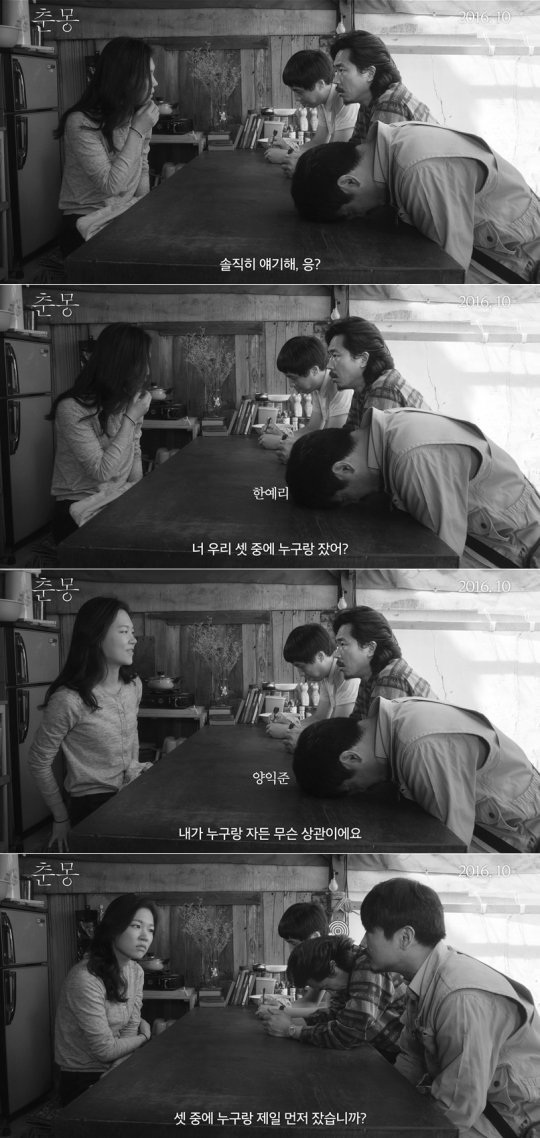 이번에 공개된 남과 여 캐릭터 영상 ‘그녀’편은 기존의 영상들과 달리 원씬 원컷으로 그들의 알쏭달쏭한 대화를 이끌어간다. 덕분에 영상을 보는 관객들로 하여금 등장인물들이 나누는 엉뚱한 이야기에 온전히 집중할 수 있게 만든다. 예리에게 솔직히 얘기하라며 운을 뗀 익준이 “우리 셋 중에 누구랑 잤어?”라고 묻자 그녀는 “내가 누구랑 자던 무슨 상관이냐”고 되묻는다.