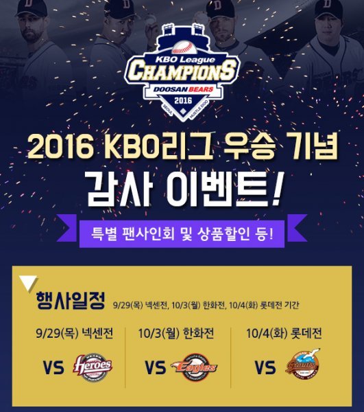 프로야구 두산베어스가 잔여 홈경기 기간 KBO 리그 우승 기념 팬 감사 이벤트를 펼친다. 해당 홈경기는 29일 넥센히어로즈전과 오는 10월 3일 한화이글스전, 그리고 10월 4일 롯데 자이언츠전이다.