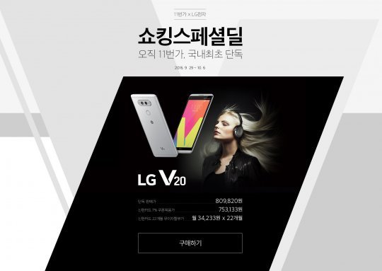 SK플래닛 11번가는 10월 6일까지 LG전자 최신 스마트폰 ‘V20’ 무약정폰을 오픈마켓 단독 판매한다고 29일 밝혔다. 무약정폰은 통신사 약정 없는 공기계다. 원하는 통신사를 선택해 요금제를 골라 가입할 수 있으며, 20% 요금약정할인도 받을 수 있다. V20은 세계최초 쿼드 DAC와 전후면 광각카메라를 적용한 제품. 11번가는 V20 무약정폰을 구매하면 LG전자가 제공하는 출시 프로모션 혜택과 함께 액정필름과 젤리케이스, 차량용·가정용 충전기 등 5가지 추가 사은품을 증정할 계획이다. 판매가는 98만9780원이며, 신한카드 22개월 무이자할부와 선착순 하루 500명에게 10% 할인 쿠폰을 제공한다.
