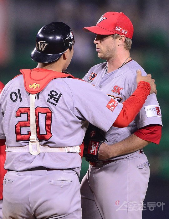 30일 잠실야구장에서 ‘2016 타이어뱅크 KBO 리그’ LG 트윈스와 SK 와이번스의 경기가 열렸다. 7회초 2사 1루에서 SK 선발 켈리가 교체를 앞두고 포수 이재원과 대화를 나누고 있다.