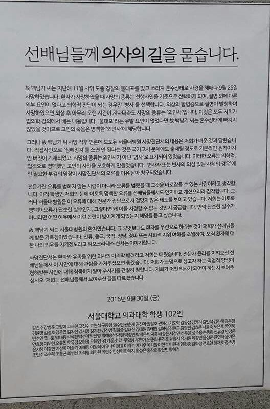 학생들 역시 성명을 통해 “질병 외에 다른 외부 요인이 없다고 의학적 판단이 되는 경우에만 ‘병사’를 선택한다”며 “‘물대포’라는 유발 요인이 없었다면 백씨가 혼수상태에 빠지지 않았을 것이므로 고인의 죽음은 명백한 ‘외인사’”라고 말했다.