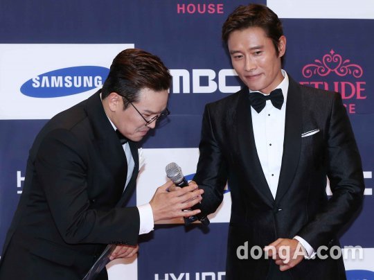 배우 이병헌(오른쪽)이 2일 오후 서울 마포구 MBC 상암에서 열린 2016 아시아 태평양 스타 어워즈 행사에 참석하고 있다.