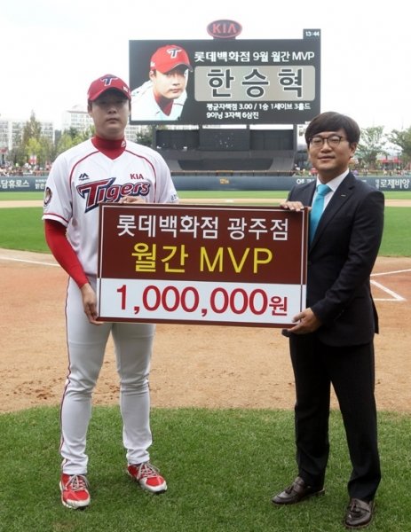 프로야구 KIA타이거즈 투수 한승혁이 롯데백화점 광주점이 시상하는 9월 월간 MVP에 선정돼 2일 광주 kt전에 앞서 시상식을 가졌다.