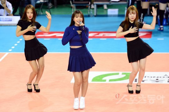 3일 청주실내체육관에서 ‘2016 청주-KOVO컵 프로배구대회’ 화성 IBK기업은행과 대전 KGC인삼공사의 여자부 결승경기가 열렸다. 가수 홍진영이 축하공연을 펼치고 있다.