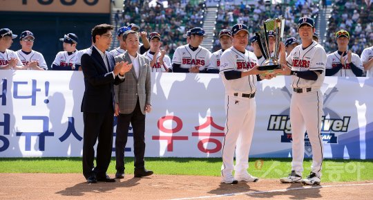 3일 서울 잠실야구장에서 열릴 ‘2016 타이어뱅크 KBO 리그’ 한화이글스와 두산베어스 경기 전 두산 정규리그 우승트로피 수여식이 진행됐다. 김태형 감독과 주장 김재호가 우승트로피를 들고 기념촬영을 하고 있다.