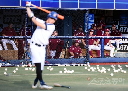 4일 창원 마산야구장에서 ‘2016 타이어뱅크 KBO리그’ NC 다이노스와 넥센 히어로즈의 경기가 열린다. 경기전 넥센 선수들이 더그아웃에서 NC 선수들의 훈련을 바라보고 있다.