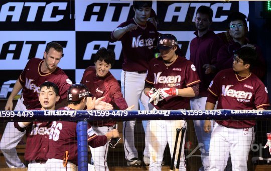 4일 창원 마산야구장에서 ‘2016 타이어뱅크 KBO리그’ NC 다이노스와 넥센 히어로즈의 경기가 열렸다. 연장 10회초 1사 1, 2루에서 넥센 김지수의 1타점 2루타 때 득점에 성공한 강지광이 동료들의 환영을 받고 있다.