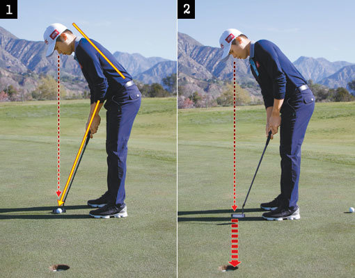 1. 올바른 어드레스는 정확한 스트로크를 위한 준비동작이다. 거리가 짧다고 해서 자세를 낮게 유지하는 것보다 평소와 같이 허리를 꼿꼿하게 세워 안정된 어드레스를 만드는 것이 중요하다. 2. 어드레스부터 퍼팅이 끝난 뒤에도 시선은 공이 있던 지점에 머물도록 유지한다.