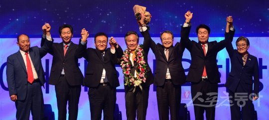 5일 서울 송파구 올림픽공원 내 올림픽홀에서 통합 대한체육회의 첫 수장을 뽑는 제40대 대한체육회장 선거가 치뤄졌다. 기호3번 이기흥 전 대한수영연맹 회장이 총 투표수 892표 가운데 294표를 얻어 당선됐다. 이기흥 신임 대한체육회 회장(가운데)이 후보자들과 함께 기념촬영을 하고 있다. 엘리트 체육을 주관하는 대한체육회와 생활체육을 담당하던 국민생활체육회가 올 3월 통합된 후 선거로 뽑힌 새 통합 회장의 임기는 2021년 2월까지다.