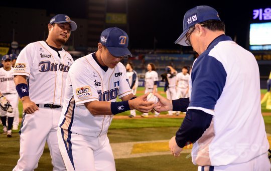 5일 창원 마산야구장에서 ‘2016 타이어뱅크 KBO리그’ NC 다이노스와 넥센 히어로즈의 경기가 열렸다. NC가 넥센에 8-4로 승리한 뒤 주장 이종욱이 김경문 감독에게 800승 볼을 건네고 있다.