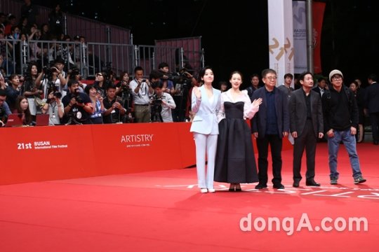 배우 이주영(왼쪽부터), 한예리, 장률 감독, 박정범 감독, 양익준 감독이 6일 오후 부산 해운대구 영화의 전당에서 열린 '제21회 부산국제영화제(BIFF)' 개막식에 참석하고 있다.