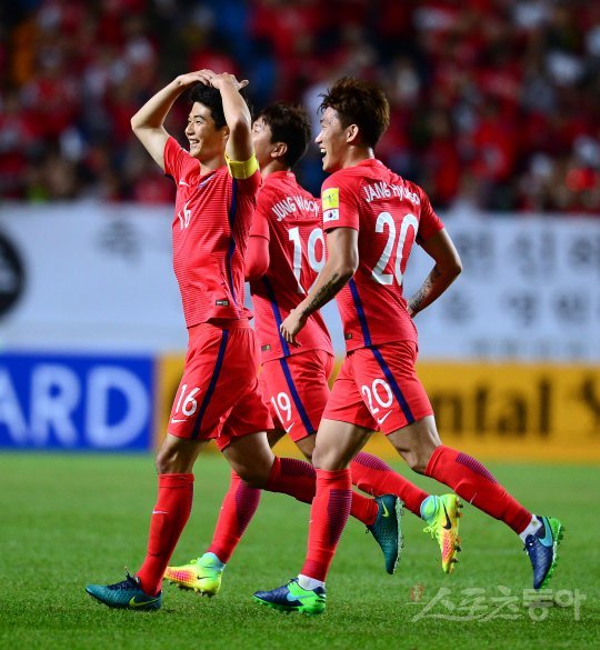 한국 축구대표팀이 4일 수원월드컵경기장에서 카타르와 2018 러시아 월드컵 아시아지역 최종예선 3차전을 가졌다. 한국 기성용이 전반 선제골을 성공시킨 후 환호하고 있다.