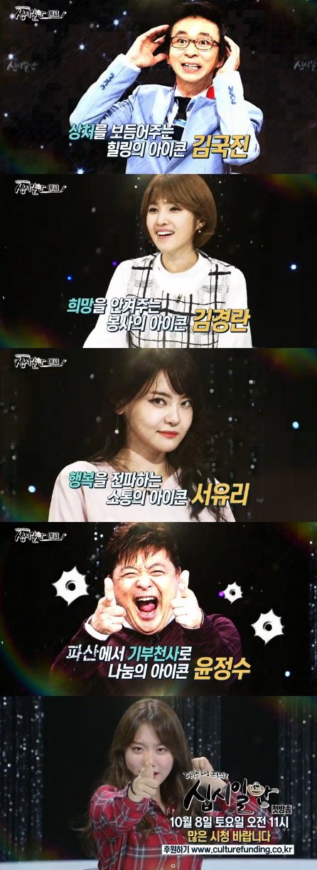 KBS1 파일럿프로그램 ‘십시일반’이 오는 8일 첫 방송된다. '십시일반'은 기존 기부 프로그램과는 달리 크라우드펀딩이라는 신개념 기부 패러다임을 도입한 프로그램이다. 지난 25일 인터넷 생중계를 통해 첫 소통을 진행한 ‘십시일반’은 김국진, 윤정수, 김경란, 서유리, 김소혜(I.O.I)가 기부군단으로 나서 주목받았다.