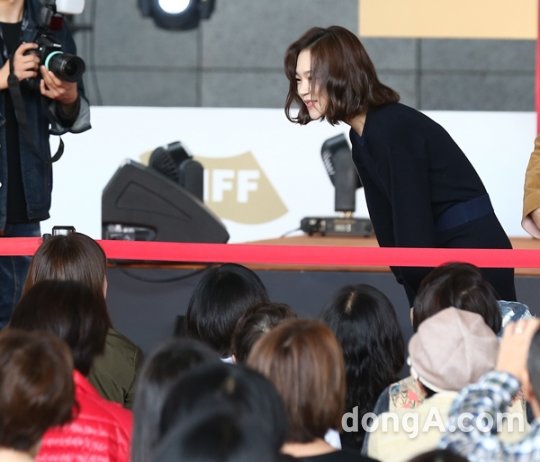 배우 한예리가 7일 오후 부산 해운대구 영화의 전당에서 열린 제21회 부산국제영화제(BIFF) 영화 '춘몽' 야외무대인사에 참석해 팬들에게 인사하고 있다.