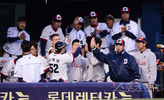 8일 잠실야구장에서 ‘2016 타이어뱅크 KBO 리그’ LG 트윈스와 두산 베어스의 경기가 열렸다. 4회초 선두타자로 나온 두산 김재호가 LG 선발 임찬규를 상대로 솔로홈런을 친 후 더그아웃에서 동료들의 축하를 받고 있다.