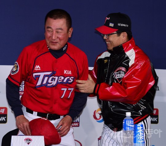9일 잠실야구장에서 ‘2016 타이어뱅크 KBO리그 와일드카드 결정전’ 미디어데이가 열렸다. LG트윈스 양상문 감독이 KIA타이거즈 김기태 감독과 웃으며 대화를 나누고 있다.