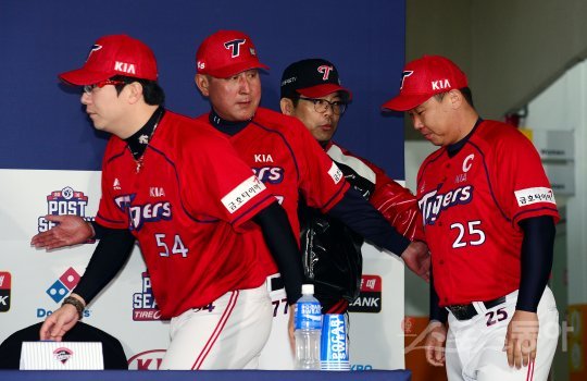 9일 잠실야구장에서 ‘2016 타이어뱅크 KBO리그 와일드카드 결정전’ 미디어데이가 열렸다. LG 트윈스 양상문 감독(오른쪽 두 번째)이 KIA 타이거즈 선수들이 지나가도록 도와주고 있다.