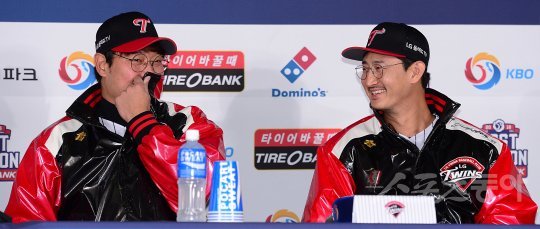 9일 잠실야구장에서 ‘2016 타이어뱅크 KBO리그 와일드카드 결정전’ 미디어데이가 열렸다. LG 트윈스 주장 류제국이 KIA 타이거즈 김기태 감독이 인터뷰 중 옷으로 입을 막고 웃음을 참고 있다.