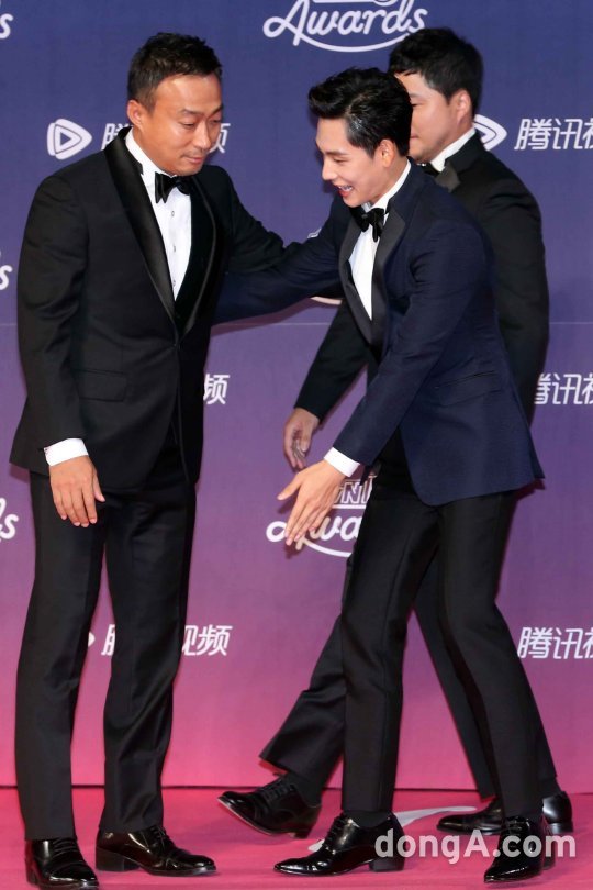 배우 이성민(왼쪽)과 임시완이 9일 오후 경기 고양 일산 서구 킨텍스 제2전시장에서 열린 tvN 페스티벌 어워즈 레드카펫 행사에 참석하고 있다.