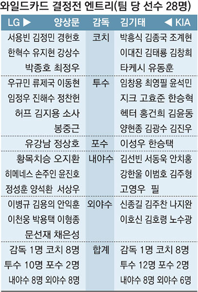 반면 KIA는 선발 헥터 노에시를 비롯해 임창용 최영필 윤석민 지크 스프루일 고효준 한승혁 홍건희 김윤동 양현종 김광수 김진우 등 총 12명의 투수를 엔트리에 모두 넣었다. 김 감독은 9일 잠실구장에서 열린 미디어데이에서 “엔트리에서 보면 알 수 있지만 전 선수가 포함됐다”며 “1차전부터 모든 선수들이 나갈 준비를 하고 있다고 생각하면 된다”고 총력전을 예고했다.