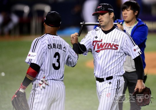 10일 서울 잠실야구장에서 ‘2016 타이어뱅크 KBO리그’ LG 트윈스와 KIA 타이거즈의 와일드카드 결정전 경기가 열렸다. 2회까지 KIA 공격을 무실점으로 막은 LG 선발 허프가 이닝종료 후 히메네스와 하이파이브를 나누고 있다.