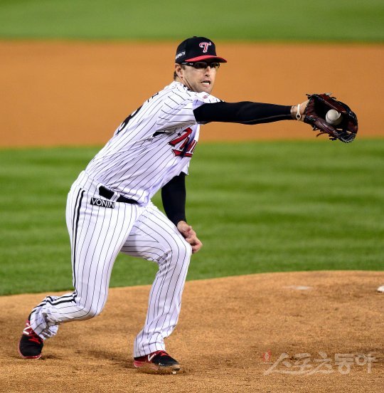 10일 서울 잠실야구장에서 ‘2016 타이어뱅크 KBO 리그’ 포스트시즌 와일드카드 결정 1차전 KIA타이거즈와 LG트윈스 경기가 열렸다. 선발 투수로 등판한 LG 허프가 1회초 무사 KIA 김선빈의 타구를 잡아 아웃시키고 있다.