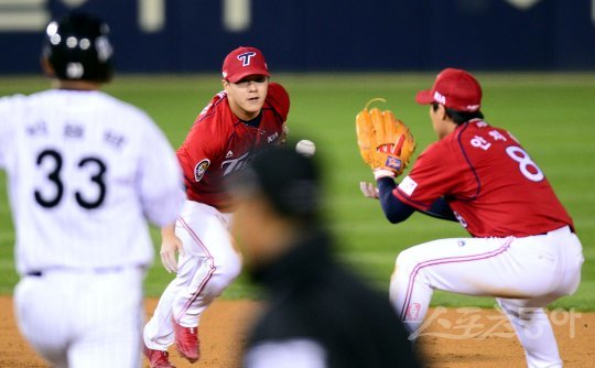 10일 서울 잠실야구장에서 ‘2016 타이어뱅크 KBO리그’ LG 트윈스와 KIA 타이거즈의 와일드카드 결정전 경기가 열렸다. 4회말 1사 1루에서 LG 채은성의 내야땅볼을 잡은 KIA 김선빈이 안치홍에게 송구하고 있다.