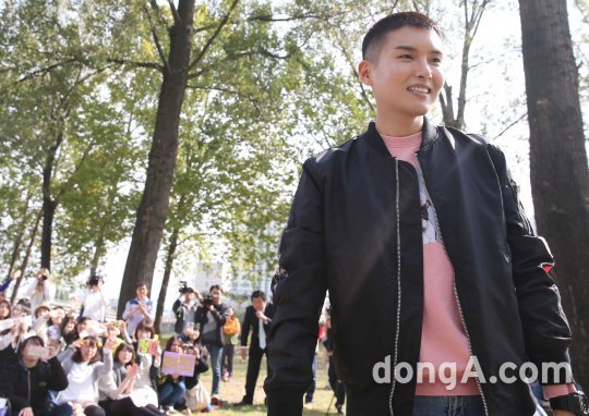 보이그룹 슈퍼주니어의 려욱이 11일 오후 충북 증평군 미루나무숲 물빛공원에서 팬들에게 인사를 하고 있다.