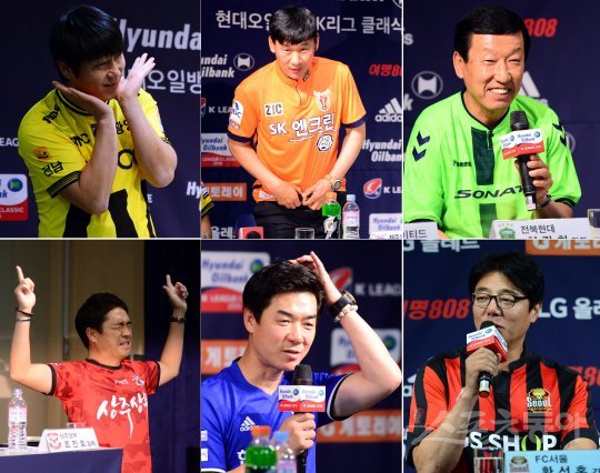 12일 서울 종로 신문로 축구회관에서 ‘현대오일뱅크 K리그 클래식 2016’ 스플릿 라운드 그룹A 미디어데이가 열렸다. 왼쪽위시계방향으로 전남 노상래 감독, 제주 조성환 감독, 전북 최강희 감독, 서울 황선홍 감독, 울산 윤정환 감독, 상주 조진호 감독이 우승공약 세리머리를 밝히고 있다.