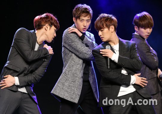 그룹 백퍼센트가 12일 오후 서울 강남구 일지아트홀에서 열린 새 미니앨범 'Time Leap(타임 리프) 발매 기념 쇼케이스에서 화려한 무대를 선보이고 있다.