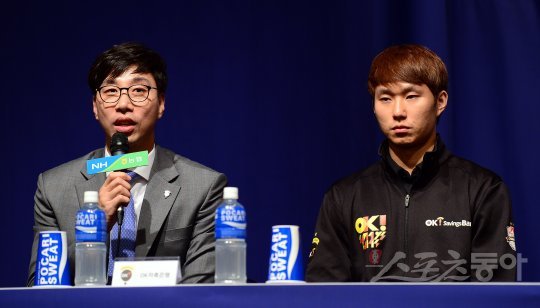 12일 서울시 강남구 리베라호텔에서 ‘NH농협 2016-2017 V리그’ 남자부 미디어데이가 열렸다. OK저축은행 김세진 감독이 취재진의 질문에 대답하고 있다.