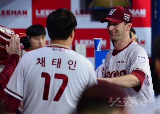 14일 서울 고척스카이돔에서 ‘2016 타이어뱅크 KBO리그 포스트시즌 준플레이오프 2차전’ 넥센 히어로즈와 LG 트윈스의 경기가 열렸다. 5회초 이닝을 무실점으로 막은 넥센 선발 밴헤켄이 더그아웃에서 동료들과 기쁨을 나누고 있다.