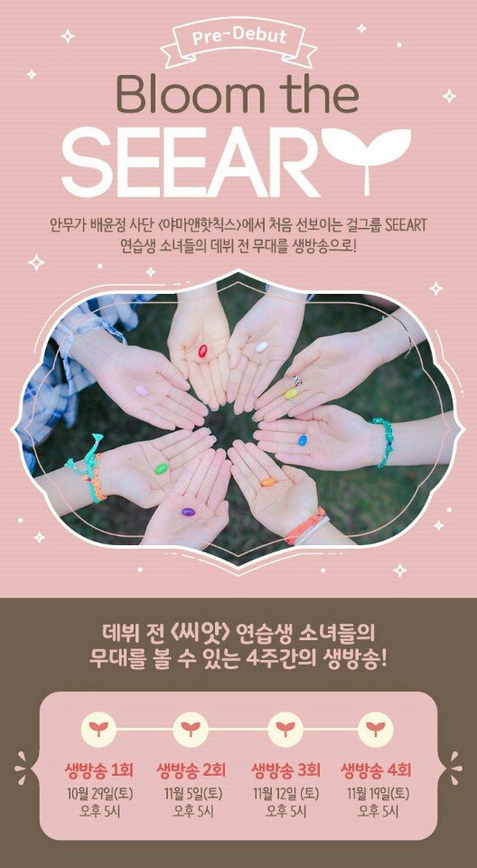 국내 최고의 안무팀 야마앤핫칙스에서 최초로 선보이는 8인조 걸그룹 '씨앗(See Art)'이 정식 데뷔에 앞서 생방송으로 무대를 먼저 선보인다.