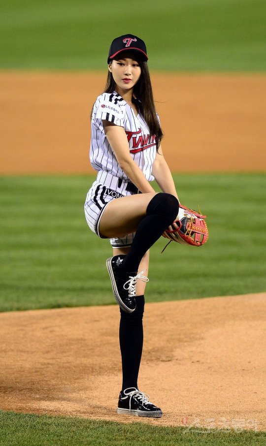 17일 서울 잠실야구장에서 ‘2016 타이어뱅크 KBO 리그’ 준플레이오프 4차전 넥센히어로즈와 LG트윈스 경기가 열렸다. 경기 전 나인뮤지스 경리가 시구를 하고 있다.