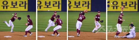 17일 서울 잠실야구장에서 ‘2016 타이어뱅크 KBO 리그’ 준플레이오프 4차전 넥센히어로즈와 LG트윈스 경기가 열렸다. 3회말 2사 1,2루 LG 채은성 땅볼 타구를 넥센 김하성이 송구 실책하고 있다. 넥센은 이 실책으로 1실점 했다.