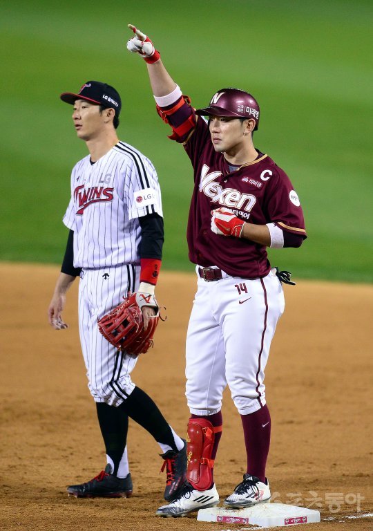 17일 서울 잠실야구장에서 ‘2016 타이어뱅크 KBO 리그’ 준플레이오프 4차전 넥센히어로즈와 LG트윈스 경기가 열렸다. 2회초 2사 2,3루 넥센 서건창 2타점 적시타 치고 1루에서 기뻐하고 있다.