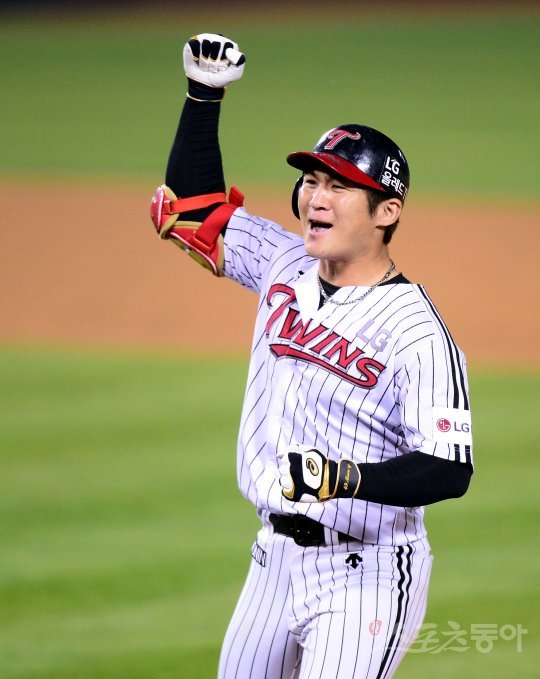 17일 서울 잠실야구장에서 ‘2016 타이어뱅크 KBO리그’ 넥센 히어로즈와 LG 트윈스의 준플레이오프 4차전 경기가 열렸다. 8회말 2사 1, 2루에서 LG 오지환이 1타점 역전 적시타를 치고난 뒤 환호하고 있다.