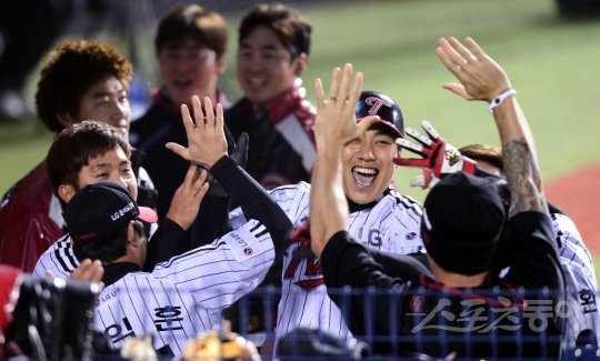 17일 서울 잠실야구장에서 ‘2016 타이어뱅크 KBO리그’ 넥센 히어로즈와 LG 트윈스의 준플레이오프 4차전 경기가 열렸다. 8회말 2사 1, 2루에서 LG 오지환의 1타점 역전 적시타 때 득점에 성공한 이천웅이 동료들의 환영을 받고 있다.