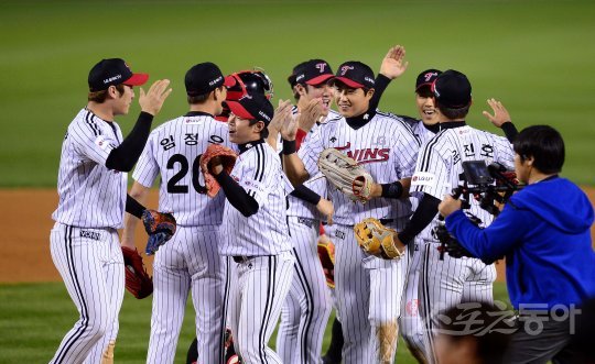 17일 서울 잠실야구장에서 ‘2016 타이어뱅크 KBO 리그’ 준플레이오프 4차전 넥센히어로즈와 LG트윈스 경기가 열렸다. 5-4 역전승을 거두며 플레이오프 진출을 확정지은 LG 선수들이 하이파이브 하고 있다.