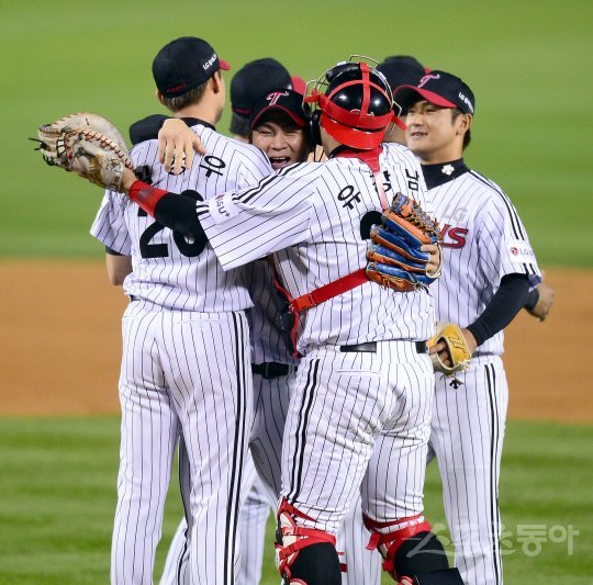 17일 서울 잠실야구장에서 ‘2016 타이어뱅크 KBO 리그’ 준플레이오프 4차전 넥센히어로즈와 LG트윈스 경기가 열렸다. 5-4 역전승을 거두며 플레이오프 진출을 확정지은 LG 오지환이 선수들과 기뻐하고 있다.