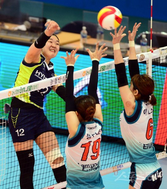 18일 수원실내체육관에서 ‘2016-2017 NH농협 V리그’ 수원 현대건설과 서울 GS칼텍스의 경기가 열렸다. 현대건설 정미선이 GS칼텍스 블로커를 피해 스파이크를 날리고 있다.
