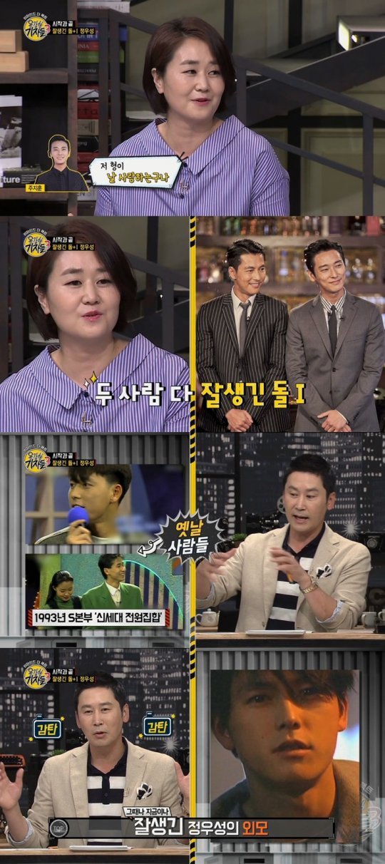 이날 한 연예부 기자는 톱 스타 정우성에 대한 이야기를 풀어냈다. 이 기자는 “잘생겼다는 이야기를 너무 듣는 배우, 정우성 이야기를 하겠다”고 입을 열었다. 그는 “정우성의 외모를 칭찬하는 수식어가 많은데 요즘 ‘잘생긴 돌I’라는 게 하나 추가됐다”며 “그의 별명을 증명해준 사람은 다름 아닌 최근 함께 영화를 찍은 주지훈”이라고 말해 궁금증을 높였다.