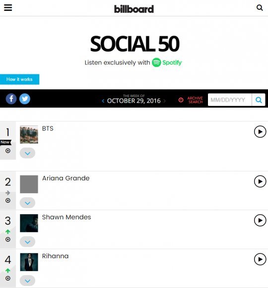 빌보드 소셜 50은 온라인 SNS에서 가장 인기 있고 영향력 있는 아티스트를 선정하는 차트로, 트위터와 페이스북, 인스타그램, 유튜브 등 다양한 소셜 네트워크 서비스의 팔로워나 좋아요, 조회수와 같은 수치들을 집계하고 분석하여 산정하는 차트이다. 앞서 미국의 저스틴 비버와 리아나, 테일러 스위프트 등 해외 유명 팝스타들이 해당 차트에서 1위를 차지한 바 있다.