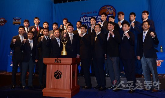 19일 서울 강남구 리베라호텔에서 ‘2016-2017 KBL KCC 프로농구 타이틀 스폰서 조인식 및 미디어데이’가 열렸다. 10개 구단 감독들과 대표 선수들, 신인 선수들이 우승 트로피를 앞에 놓고 포즈를 취하고 있다.