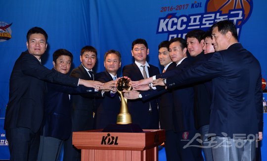 19일 서울 강남구 리베라호텔에서 ‘2016-2017 KBL KCC 프로농구 타이틀 스폰서 조인식 및 미디어데이’가 열렸다. 10개 구단 감독들이 우승 트로피를 앞에 놓고 포즈를 취하고 있다. 왼쪽부터 원주 동부 김영만 감독, 인천 전자랜드 유도훈 감독, 서울 삼성 이상민 감독, 울산 모비스 유재학 감독, 전주 KCC 추승균 감독, 부산 kt 조동현 감독, 창원 LG 김진 감독, 서울 SK 문경은 감독, 안양 KGC 김승기 감독, 고양 오리온 추일승 감독.