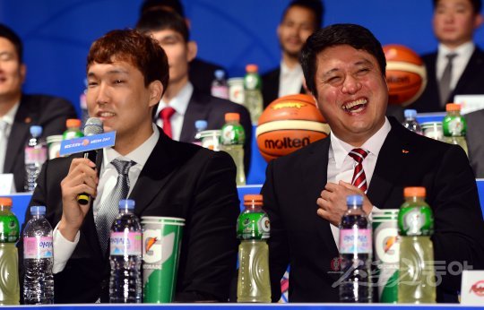 19일 서울 강남구 리베라호텔에서 ‘2016-2017 KBL KCC 프로농구 타이틀 스폰서 조인식 및 미디어데이’가 열렸다. 서울 SK 문경은 감독이 울산 모비스 신인 이종현의 답변에 환하게 웃고 있다.
