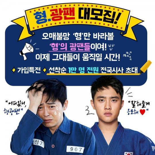 대세 배우 조정석과 충무로 블루칩 도경수의 만남과 함께 코믹한 형제의 모습이 담긴 1차 예고편 공개로 벌써부터 많은 이들의 관심을 한 몸에 받고 있는 만큼 이번 ‘형’광팬 모집 이벤트는 팬들에게 반가운 소식으로 다가간다.